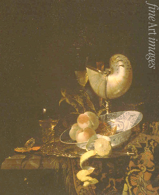 Weinglas, Pfirsiche, Obst, Teller, Auf dem Tisch, Gedeckter Tisch, Pokal, Barock, Stilleben, Zitrone, Perlmuttpokal, Nautiluspokal, Nautilusgefäß, Nautilusbecher, Nautilus-Pokal