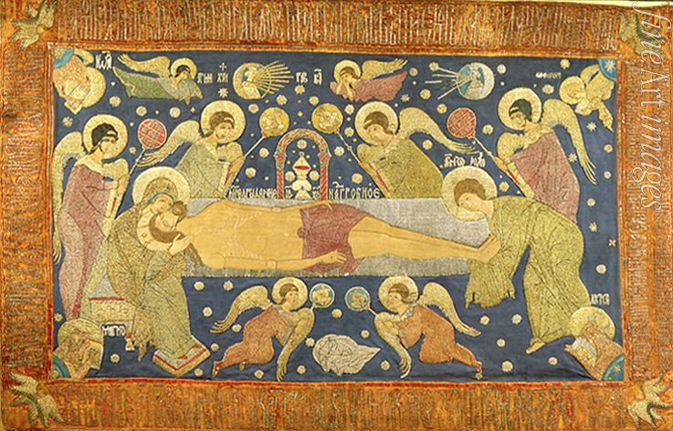 Symbolismus, Spirituell, Grablegung, Trauer, Trauermusik, Abschied, Elegie, Tod, Beerdigung, Requiem, Bibel, Neues Testament, Maria, Gottesmutter, Heilige Josef, Maria Magdalena, Josef von Nazaret, Christentum, Pietà, Frömmigkeit, Mitleid, Vesperbild, Kreuzabnahme Jesu, Beweinung, Leben und Tod, Heiliger, Marienbild, Orthodoxe Kirche, Russische Kirche, Leichnam Jesu Christi, Beweinung Christi, Marienfigur, Madonnenbild, Grablegung Christi, Begräbnis, Heiliger Josef, Altrussische Kunst, Schmerzen Mariens, Mater Dolorosa, Magdalena, Heiliger Joseph, Epitaphios, Grabtuch, Altartuch, Kirchliche Stickerei, Schmerzensmutter, Leichnam, Leiche