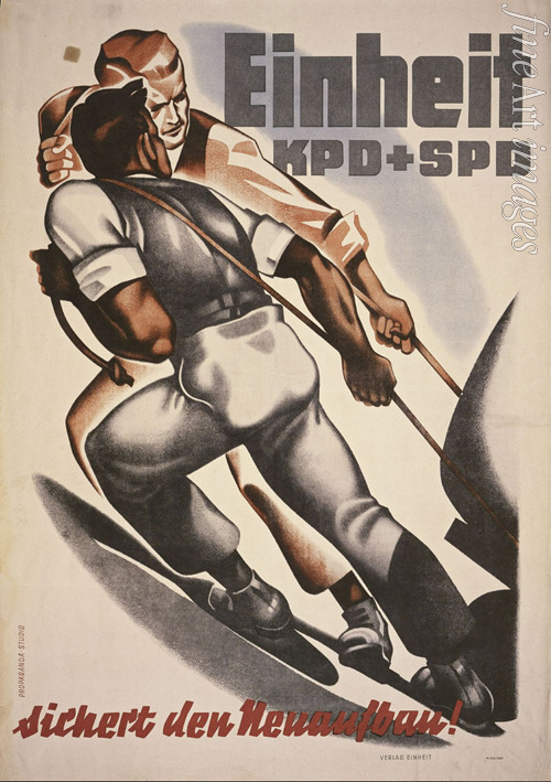 Einheit KPD + SPD sichert den Neuaufbau! Propagandaplakat zur Vereinigung von SPD und KPD
