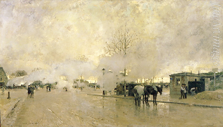 Paris, Frankreich, Stadtbild, Licht, Abend, Impression, Reise, Pferde, Rauch, Pariser Bahnkreislinie, Bahn, Bahnhof, Eisenbahn, Zug, Bahnsteig, Dampflokomotive, Französische Malerei, Geschichte der Eisenbahn, Technikgeschichte, Verkehr, Verkehrsgeschichte, Triebfahrzeug, Bahnstrecke, Schienen, Dampflok, Bahnreise