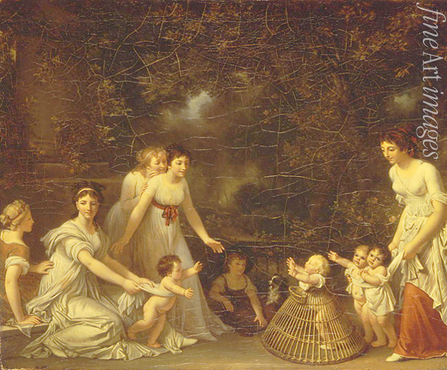 Frankreich, Poesie, Glück, Zärtlichkeit, Mutterschaft, Mutterliebe, Mutter und Kind, Interieur, Familienleben, Kind, Familie, Mutter, Alltag, Familienszene, Genreszene, Heim, Häusliches Leben, Lauflernhilfe, Gängelwagen, Gehfrei, Lauflernschule, Babywalker