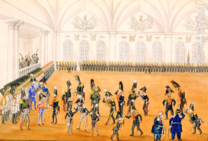 Russland, Satire, Aquarell, Manege, Wache, Kosaken, Hof, Parade, Wachparade, Paradehalle, Russische Kaiserliche Garde, Leibgarde, Leibgardist, Dragoner, Husaren, Leib-Garde, Kosak, Leib Garde
