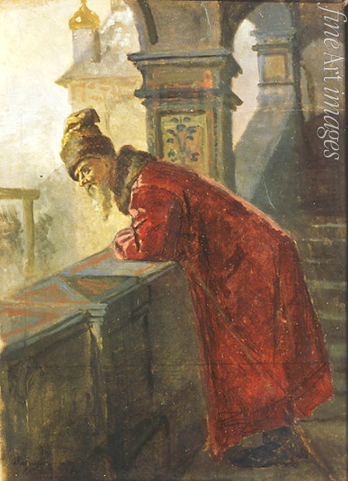 Mann, Tracht, Adel, Aristokratie, Staatsmann, Folklore, Brauchtum, Russische Geschichte, Bojaren, Zeit der Wirren, Trachtenkleidung, Altrussische Architektur, Moskowien, Smuta, Großfürstentum Moskau, Bojar, Altrussland, Bojar an der Brüstung