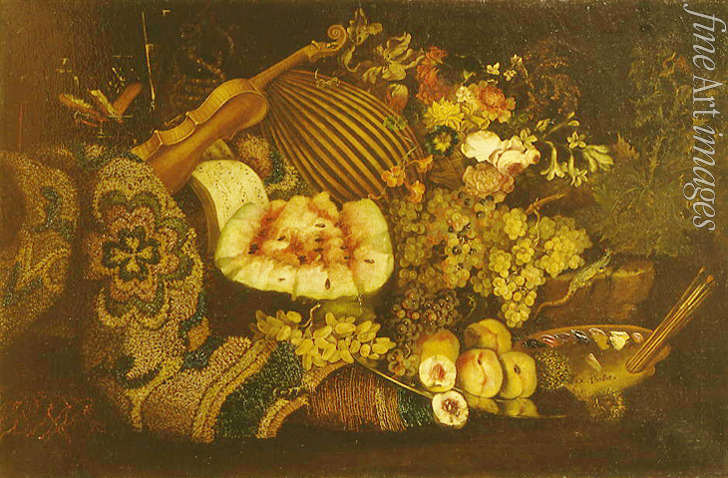 Blumen, Musik, Früchte, Blumenstrauß, Musikinstrumente, Violine, Pfirsiche, Obst, Fein, Elegant, Barock, Stilleben, Palette, Attribute der Künste, Laute, Geige, Weintrauben, Melone, Musikinstrument, Lautenist, Lautenistin, Orientalisches Teppich, Bouquet