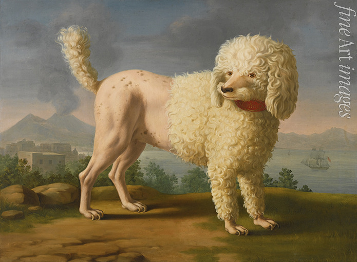 Portrait von Codina, Lady Hamiltons Pudel, mit einem britischen Linienschiff und dem Vesuv im Hintergrund