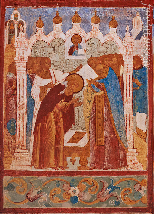 Die Mönchsweihe des Heiligen Abraham von Rostow. Fresko der Johanneskirche des Rostower Kremls