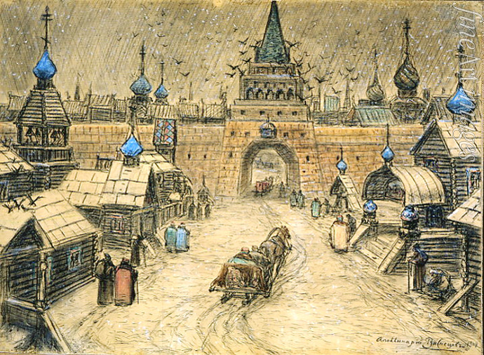 Winter, Stadtbild, Russland, Russische Architektur, Stadt, Moskau, Wanderer, Genreszene, Folklore, Tradition, Architektur, Brauchtum, Russische Geschichte, Russischer Winter, Kreml, Moskauer Kreml, Geschichte Russlands, Moskowien, Großfürstentum Moskau, Moskau des 17. Jahrhunderts, Peredwischniki