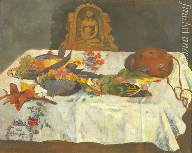 Blumen, Tahiti, Cloisonismus, Südsee, Polynesien, Sonnenlicht, Licht, Farbigkeit, Papageien, Tischdecke, Auf dem Tisch, Impressionismus, Impressionisten, Papagei