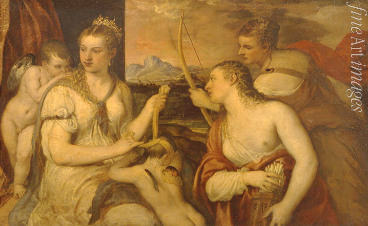 Renaissance, Römische Mythologie, Kindheit, Allegorie, Venus verbindet Amor die Augen, Göttin der Liebe, Eros, Erziehung, Bogen