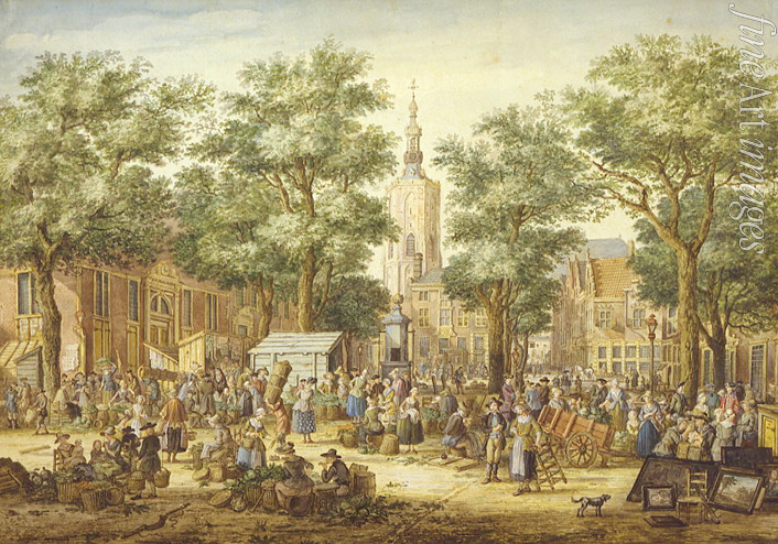 Stadtbild, Barock, Verkäufer, Stadt, Holland, Alltag, Genreszene, Folklore, Markt, Verkauf, Brauchtum, Marktfrau, Marktplatz, Jahrmarkt, Bude, Marktbude, Markt in Den Haag, Den Haag, Prinsengracht, Grote Kerk, St Jacobskerk