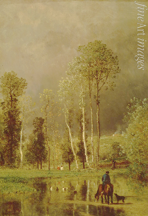 Sommer, Frankreich, Natur, Jahreszeiten, Poesie, Bäume, Licht, Am Lande, Wiese, Fluss, Ufer, Park, Wald, Reiter, Hund, Landschaft, Realismus, Unwetter, Gewitter, Jäger, Regen, Schauer, Französische Malerei, Heranrückender Sturm