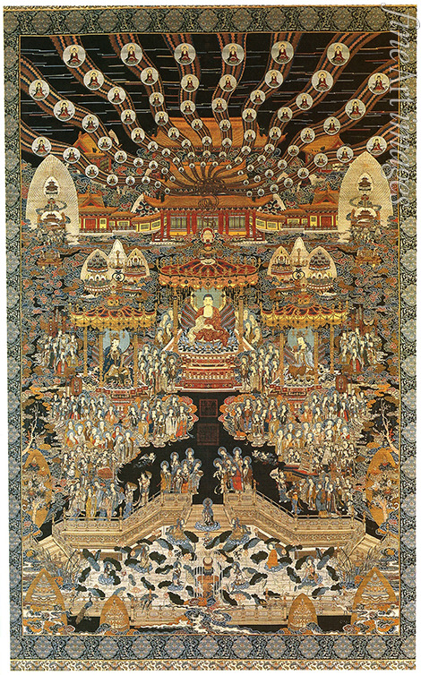 Dekorativ, Druck, Modern, Gottheit, Stoffmuster, Buddhismus, Rituale, Tibet, Tibetisch-buddhistische Kultur, Himalaya, Hochland von Tibet, Bodhisattva, Lama, Design, Seide, Textil, Sadhana, Meditation, Mantras, Yoga, Drucktechnik, Buddha, Stoff, Stoffdesign, Amitabha, Xia-Dynastie, Xi Xia, Reine Land Amitabhas, Reines Land, Gewebe, Amida, Sukhavati, Print