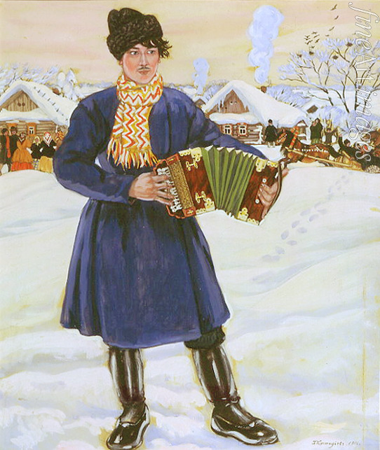 Winter, Winterlandschaft, Schnee, Frost, Jahreszeiten, Mardi Gras, Karneval, Volksfest, Fasching, Fastnachtszeit, Farbigkeit, Jugendstil, Häuser, Russland, Belustigung, Feier, Folklore, Brauchtum, Provinz, Russischer Winter, Faschingszeit, Spass, Wiener Secession, Harmoschka, Garmon, Akkordeon, Garmoshka, Garmonika, Art nouveau, Modern Style, Modernisme, Stile Liberty, Reformstil, Stil Modern, Fin de siècle, Masleniza, Betonung auf der ersten Silbe, Butterwoche, Garmon-Spieler, Garmonspieler, Ziehharmonika, Fastnachtsdienstag, Faschingsdienstag, Karnevalsdienstag