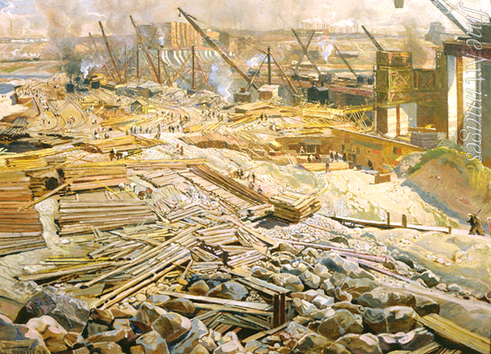 Russland, Proletariat, Ukraine, Bau, Bauarbeiten, Arbeiter, Sowjetische Agitations- und Propagandakunst, Sowjetunion, Propaganda, Agitation, Dnjepr, Proletarier, Wirtschaft, Industrialisierung, Aufbau der UdSSR, UdSSR, Elektrifizierung, Dnepr, Sozialistischer Realismus, Sozrealismus, Dnjeprostroj, Dnieprostoi, "DneproGES", Wasserkraftwerk, Kraftwerk, Stausee, Talsperre, Talsperren, Dnepr-Wasserkraftwerk, Dneproges, Dnjepr-Talsperre, Fünfjahresplan, Stoßarbeit, Stoßarbeiter, Stoßarbeiterin, Helden der Sozialistischen Arbeit, GOELRO-Plan, GOELRO, Dnepr-Stausee, Dnjepr-Stausee
