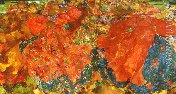 Schlüssel-wörter: Dekorativ, Tanz, Jugendstil, Russland, Lust, Wind, Frauen, Belustigung, Tracht, Genreszene, Folklore, Brauchtum, Provinz, Wirbelwind, Bäuerinnen, Lächeln, Trachtenkleid, Dorfbewohner, Wiener Secession, Art nouveau, Modern Style, Modernisme, Stile Liberty, Reformstil, Stil Modern, Fin de siècle, Bauerntanz