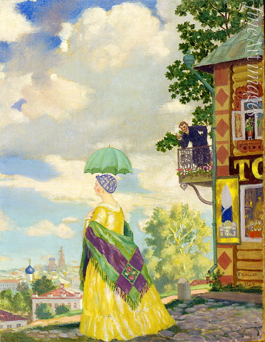 Dekorativ, Stadtbild, Straße, Dame, Frau, Häuser, Russland, Kirche, Platz, Spaziergang, Strassenszene, Alltag, Genreszene, Folklore, Brauchtum, Provinz, Regenguss, Regenschirm, Marktfrau, Stadtszene, Glockenturm, Kaufmannsfrau, Schirm