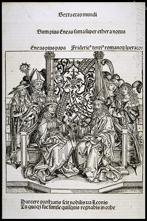 Schlüssel-wörter: Heiliges Römisches Reich, Nürnberger Chronik, Schedelsche Weltchronik, Weltchronik, Hartmann Schedel, Schedel, Friedrich III., Kaiser Friedrich III., Papst Pius II., Pius II., Eleonore von Portugal, Eleonore Helena von Portugal, Liber Chronicarum, Papst-Kaiser-Treffen