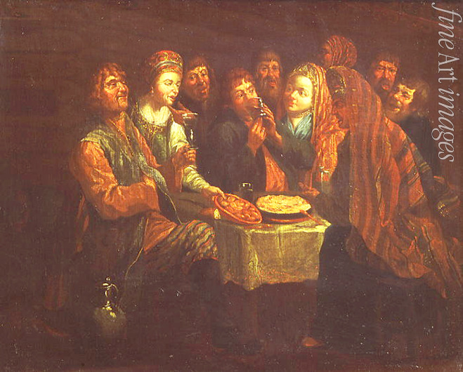 Am Tisch, Bauern, Bauernleben, Kneipe, Trinken, Wein, Schenke, Russland, Belustigung, Trinkerei, Trinkgelage, Gelage, Heiterkeit, Lustigkeit, Betrunkene, Betrunkenheit, Genreszene, Weinkrug, Säufer, Saufen, Taverne, Die Trinker, Betrunkener, Kabak