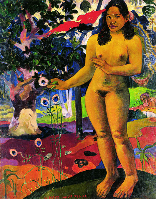 Tahiti, Cloisonismus, Südsee, Polynesien, Dorf, Rosa, Sonnenlicht, Bäume, Tahitianerinnen, Nackt, Nacktheit, Nacktes Mädchen, Paradies, Frau, Frucht, Hütten, Impressionismus, Impressionisten