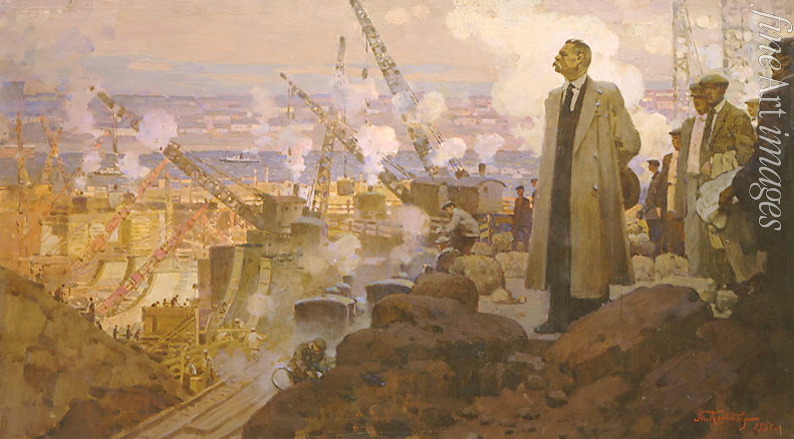 Russland, Proletariat, Ukraine, Bau, Bauarbeiten, Arbeiter, Sowjetische Agitations- und Propagandakunst, Sowjetunion, Propaganda, Agitation, Dnjepr, Proletarier, Wirtschaft, Industrialisierung, Aufbau der UdSSR, UdSSR, Elektrifizierung, Dnepr, Sozialistischer Realismus, Sozrealismus, Dnjeprostroj, Dnieprostoi, "DneproGES", Wasserkraftwerk, Kraftwerk, Stausee, Talsperre, Talsperren, Gorki, Maxim Gorki, Dnepr-Wasserkraftwerk, Dneproges, Dnjepr-Talsperre, Fünfjahresplan, Stoßarbeit, Stoßarbeiter, Stoßarbeiterin, Helden der Sozialistischen Arbeit, GOELRO-Plan, GOELRO, Dnepr-Stausee, Dnjepr-Stausee
