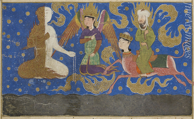 Islam, Handschrift, Buchminiatur, Mohammed, Koran, Buchmalerei, Manuskript, Bilderhandschrift, Persische Miniaturmalerei, Islamische Kunst, Miniaturmalerei, Muhammed, Muhammad, Mekka, Kaaba, Qur'an, Buraq, Himmelfahrt Mohammeds, Fariduddin Attar, Miniatur, Miradschname, Isra, Mi'radsch