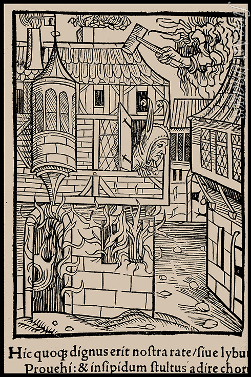Satire, Narr, Schicksal, Bajazzo, Spassmacher, Halskrause, Brant, Fortuna, Macht des Schicksals, Glücksgöttin, Schicksalsgöttin, Spaßmacher, Narrenschiff, Sebastian Brant, Schicksalsrad, Glücksrad, Rota Fortunae, Narrheit, Narrheit der Menschen, Stultifera Navis, Spottvogel, Spötter, Schalk, Schelm, Witzbold, Joker, Hanswurst, Kasper, Kasperl, Kasperle
