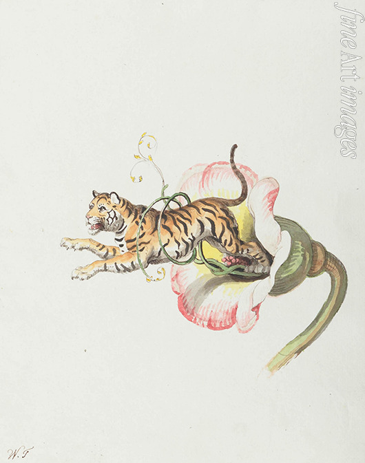 Tiger, aus einer Blütenkrone springend. Allegorie auf Blumensamen