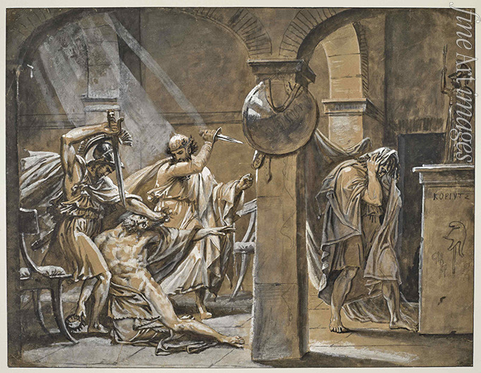 Feder, Pinsel, braune Tinte, weisse Farbe, schwarze Kreide auf Papier