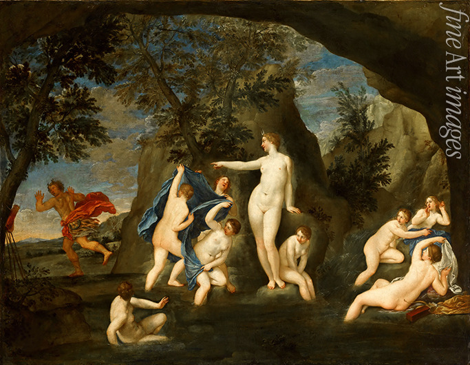 Nackt, Nacktheit, Dame, Nackte Frau, Frau, Baden, Fluss, Schönheit, Ufer, Wald, Badende, Jagd, Diana, Göttin der Jagd, Mythologie, Hirsch, Römische Mythologie, Griechische Mythologie, Artemis, Diana und Aktaion, Böotien, Nymphen, Verwandlung, Römische Antike, Gottheit, Akt, Aktaion, Aktäon, Aktaeon, Actaeon
