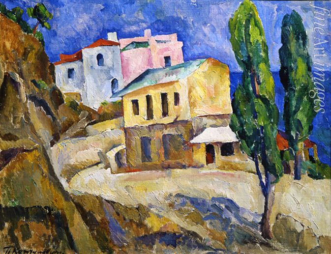 Sommer, Sonne, Sonnenlicht, Bäume, Licht, Farbigkeit, Mittag, Tageszeiten, Lichtwirkung, Küste, Meeresküste, Bucht, Felsen, Impression, Russland, See, Erholung, Russische Avantgarde, Expressiv, Schwarzes Meer, Krim, Süden, Kurort, Urlaub, Golf von der Krim, Auf der Krim, Erholung Urlaub, Alupka, Schellbube, Karo-Bube