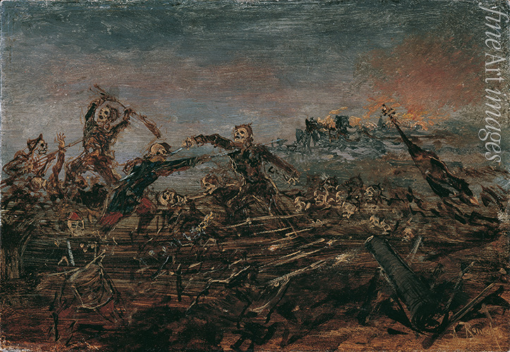 Totentanz auf dem Schlachtfeld vor brennenden Ruinen