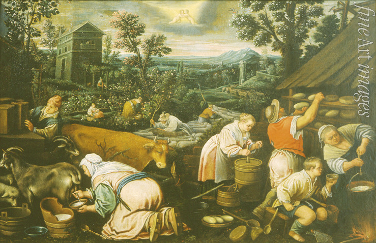 Jahreszeiten, Poesie, Stadtbild, Mittag, Tageszeiten, Am Lande, Frühling, Bauern, Bauernleben, Bauer, Italien, Familienleben, Landfrau, Bäuerin, Renaissance, Milchfrau, Handel, Verkäufer, Verkäuferin, Bauernmarkt, Hühner, Milch, Italienische Landschaft, Alltag, Milchhändler, Bauernfamilie, Beruf, Italienische Stadt, Mai, Tierkreis, Tierkreiszeichen, Sternzeichen, Zodiak, Sternbild, Kalender, Monatsbilder, Monatsarbeiten