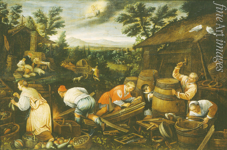 Sommer, Jahreszeiten, Poesie, Stadtbild, Mittag, Tageszeiten, Am Lande, Bauern, Bauernleben, Italien, Familienleben, Renaissance, Italienische Landschaft, Alltag, Bauernfamilie, Beruf, Fass, Italienische Stadt, Schmidt, August, Fässer, Holzfass, Fassbinder, Böttcher, Küfer, Holzfassherstellung, Böttcherei, Fassbinderei, Tierkreis, Tierkreiszeichen, Sternzeichen, Zodiak, Sternbild, Kalender, Monatsbilder, Monatsarbeiten