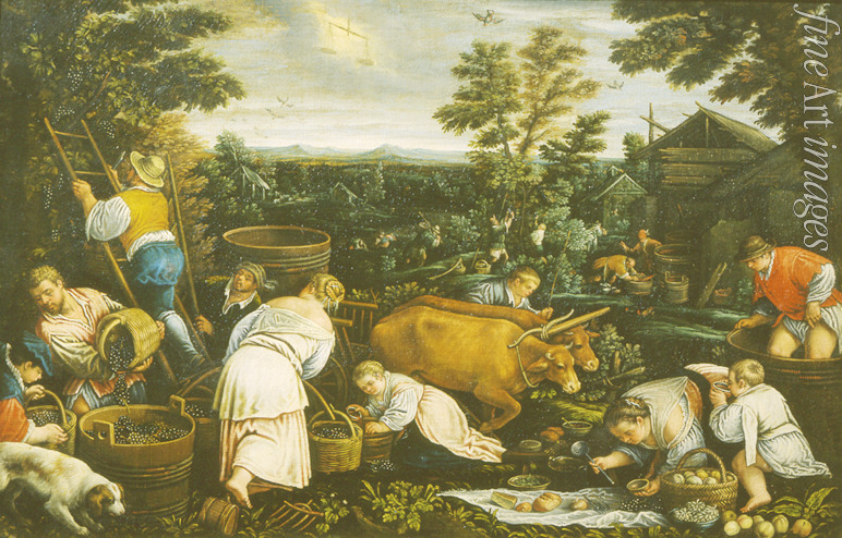 Obsternte, Jahreszeiten, Poesie, Herbst, Weinlese, Mittag, Tageszeiten, Am Lande, Bauern, Bauernleben, Wein, Bauer, Italien, Familienleben, Landfrau, Bäuerin, Renaissance, Italienische Landschaft, Alltag, Bauernfamilie, Beruf, September, Weinernte, Obstbauer, Tierkreis, Tierkreiszeichen, Sternzeichen, Zodiak, Sternbild, Kalender, Monatsbilder, Monatsarbeiten