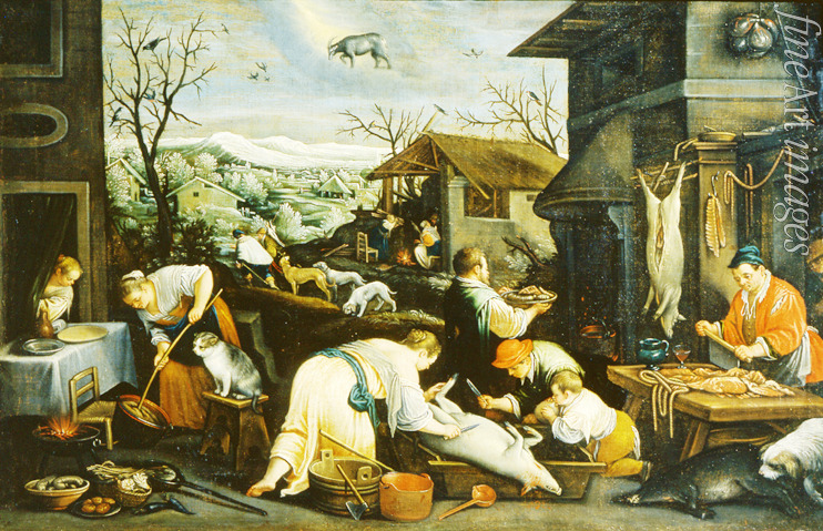 Winter, Jahreszeiten, Poesie, Mittag, Tageszeiten, Am Lande, Bauern, Bauernleben, Italien, Wild, Renaissance, Hund, Alltag, Beruf, Metzgerei, Metzger, Fleisch, Fleischer, Fleischerei, Fleischerladen, Fleischwaren, Rindfleisch, Lammfleisch, Dezember, Tierkreis, Tierkreiszeichen, Sternzeichen, Zodiak, Sternbild, Kalender, Monatsbilder, Monatsarbeiten