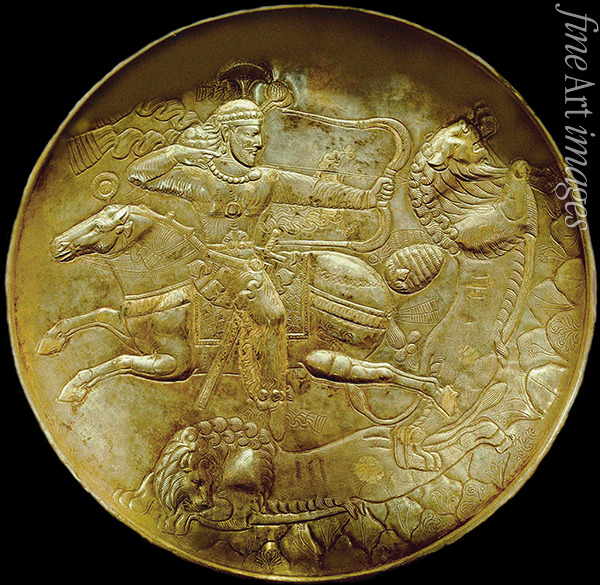 Platte mit einem Bogenschützen auf der Löwenjagd