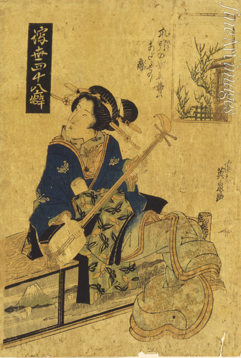 Musik, Musikinstrumente, Musikant, Musizieren, Holzschnitt, Japan, Edo-Zeit, Asien, Japanische Kunst, Fernosten, Ostasien, Ukiyo-e, Shamisen, Shamisenspielerin, Musikinstrument