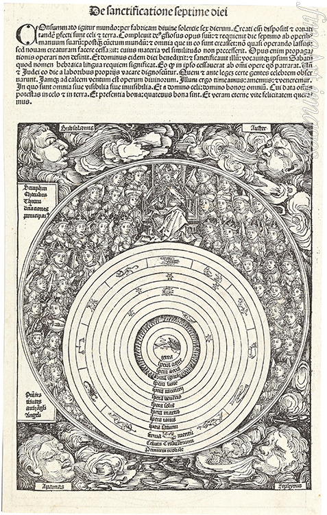 Bibel, Altes Testament, Mythologie, Gott, Schöpfung, Schöpfungsgeschichte, Astronomie, Religion, Creatio, Kreation, Universum, Erschaffung der Welt, Ursprung der Welt, Ursprung, JHWH, YHWH, Jahwe, Jehova, Jehovah, Schöpfer des Himmels und der Erde, Gott Vater, Tierkreis, Tierkreiszeichen, Sternzeichen, Zodiak, Sternbild, Nürnberger Chronik, Schedelsche Weltchronik, Weltchronik, Hartmann Schedel, Schedel, Gottvater, Kalender, Liber Chronicarum, Schöpfung Gottes, 7. Tag