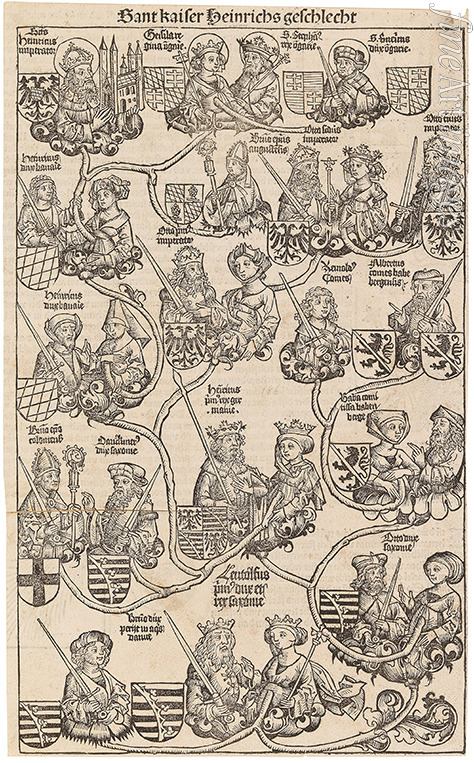 Titel:Genealogia divi heinrici imperatoris. Der Stammbaum des Kaisers Heinrich II. (aus der Schedelschen Weltchronik)