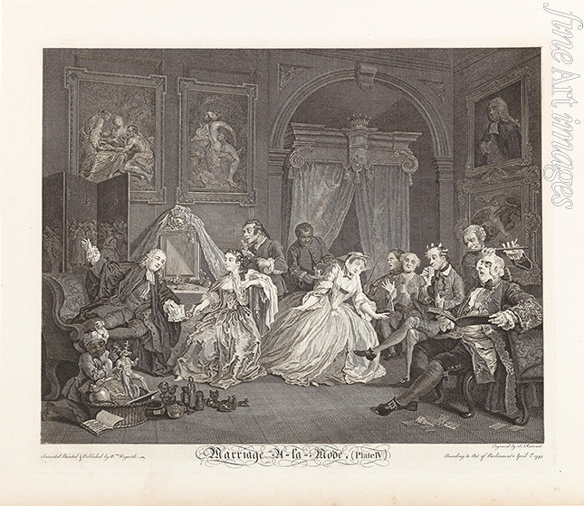 Satire, Hochzeit, Braut, Brautpaar, Trauung, Geld, Menschlichkeit, Verschulden, Gier, Fülle, Bräutigam, Reichtum, Verlobung, Heirat, Eheschließung, Hochzeitsbrauch, Anwalt, Rechtsanwalt, Ehevertrag, Notar, Verlöbnis, Englische Malerei, Marriage a la Mode, Heirat nach der Mode, Wohlstand, Vermögensstand, Vermögen, Matrimonium, Hochzeitspaar