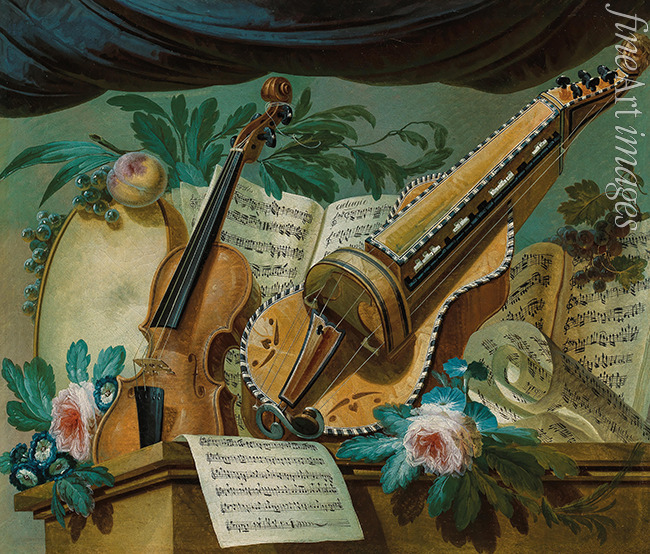 Allegorie der Musik mit Violine, Drehleier, Rahmentrommel, Noten, Blumen und Früchten auf einer steinernen Plinthe