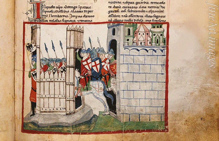 Die Schlacht bei Parma am 18. Februar 1248: Die Welfen greifen Friedrichs II. Lager Vittoria an. Aus: Nuova Cronica von Giovan