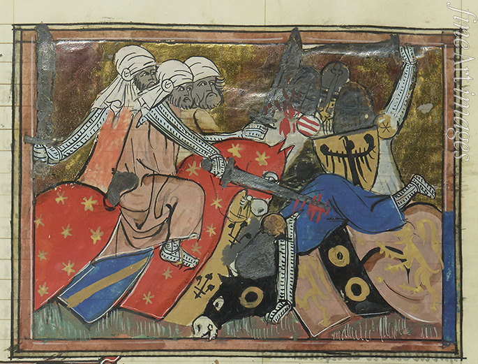Schlüssel-wörter: Ritter, Kreuzzug, Kreuzfahrer, Kreuzritter, Handschrift, Mittelalter, Buchmalerei, Manuskript, Bilderhandschrift, Ritterorden, Kreuzzüge, Miniatur, Schlacht von Ager Sanguinis, Schlacht auf dem Blutfeld, Schlacht von Sarmeda