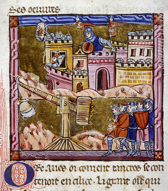 Ritter, Kreuzzug, Kreuzfahrer, Kreuzritter, Handschrift, Mittelalter, Buchmalerei, Manuskript, Bilderhandschrift, Ritterorden, Kriegskunde, Kreuzzüge, Miniatur, Katapult, Wurfmaschine, Kriegsmaschine, Catapulta