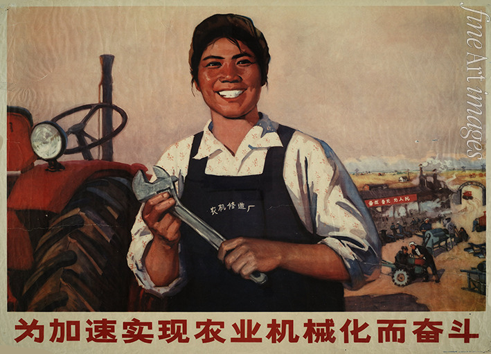 Frau, Lied, Landwirtschaft, Propaganda, Plakat, Agitation, Traktor, China, Politisches Plakat, Mao Zedong, Mao, Mao Tse-tung, Kulturrevolution, Vorsitzender Mao, Volksrepublik China, Maoismus, Großer Sprung nach vorn, Loblied, Mao Tsetung, Volkskommune, Chinesische Frau, Kommunistischer Jugendverband Chinas
