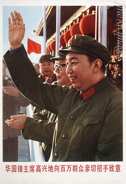 Vorsitzender Hua Guofeng hebt glücklich die Hand, um die Millionen zu begrüßen