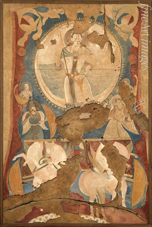 Sonnengott Surya auf seinem Streitwagen. Kopie einer Wandmalerei in der Nische einer Buddha-Statuen von Bamiyan aus dem 7. Jh. 2