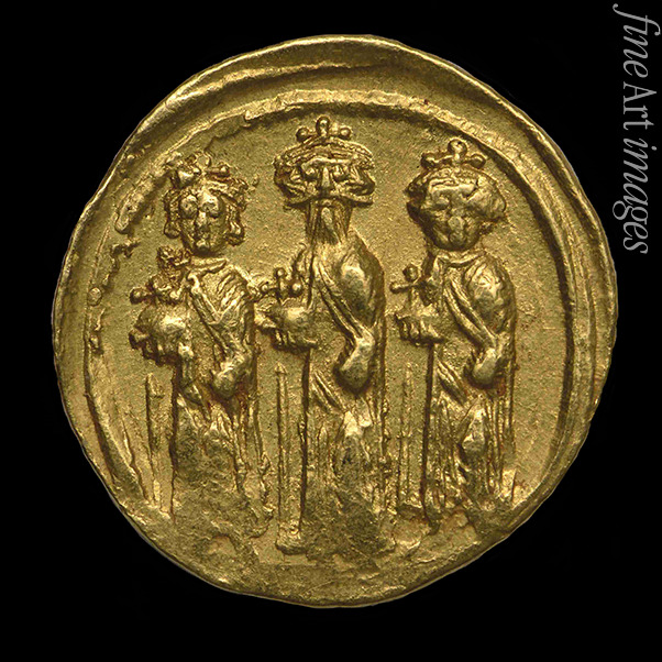 Solidus des Kaisers Heraklios. Avers: Heraklios in der Mitte, rechts Konstantin III., links Heraklonas