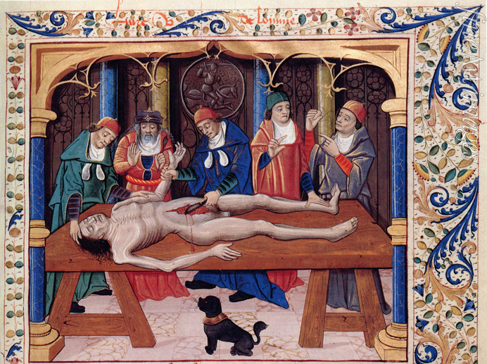 Medizin, Geschichte der Medizin, Handschrift, Mittelalter, Chirurgie, Buchmalerei, Mediziner, Manuskript, Bilderhandschrift, Geschichte der Anatomie, Anatomisches Theater, Anatomie, Miniatur, Obduktion, Autopsie, Sektion