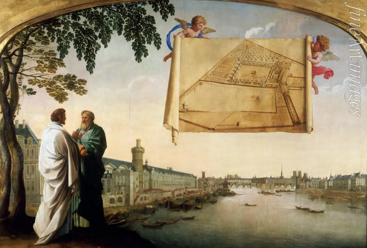Vue de Paris avec le plan de la Chartreuse de Paris porté par deux angelots